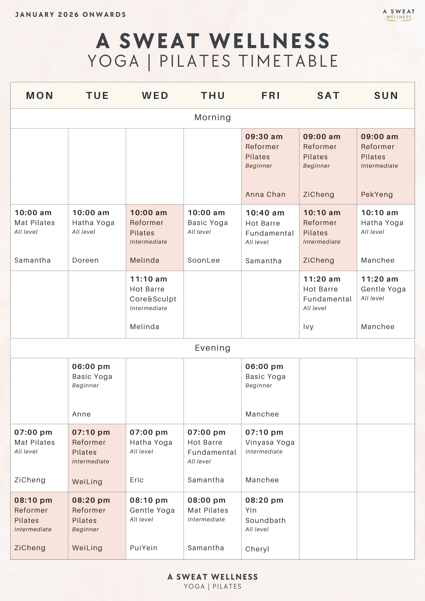 At A Sweat Wellness Hot Yoga | Pilates, we pride ourselves on our intimate class sizes, fostering a better experience for our members. With a maximum capacity of just 4 for reformer Pilates and 12 for mat classes, you’ll enjoy a spacious environment where personalized attention and guidance from our experienced instructors are prioritized. This small group setting not only allows for tailored feedback but also promotes better progress in your practice, ensuring you receive the support you need to thrive.